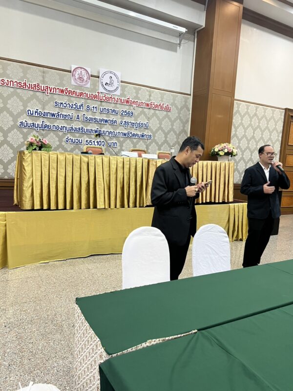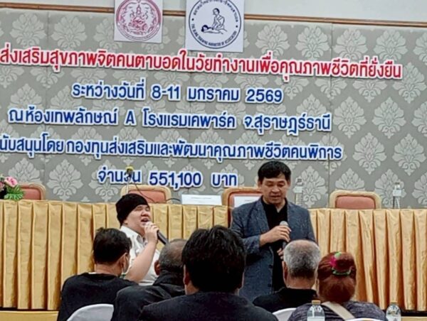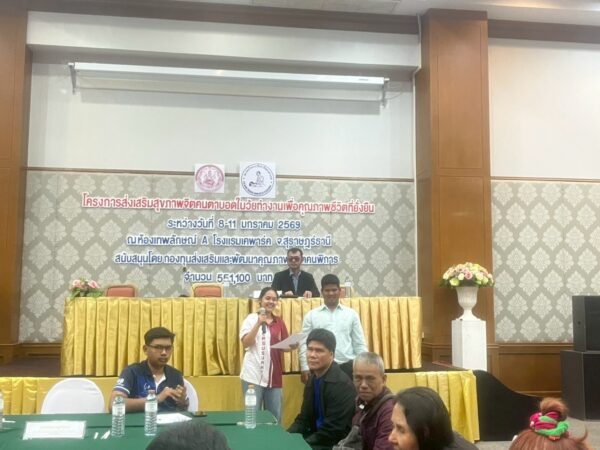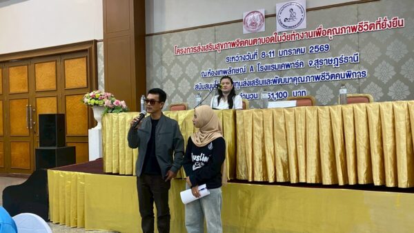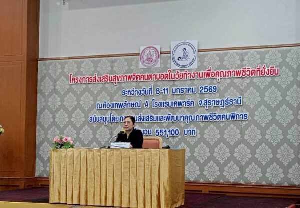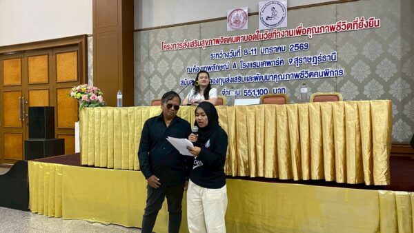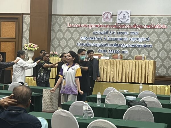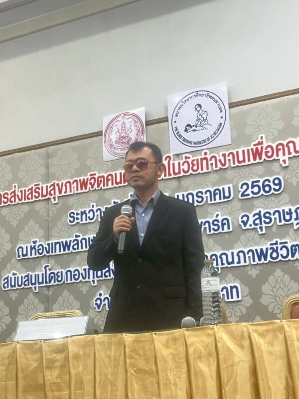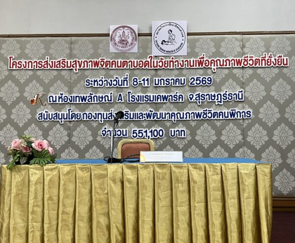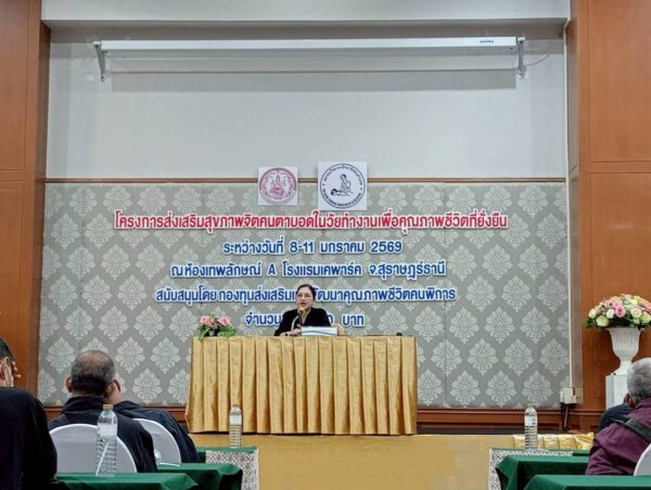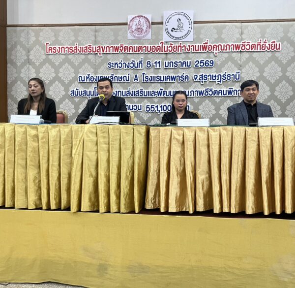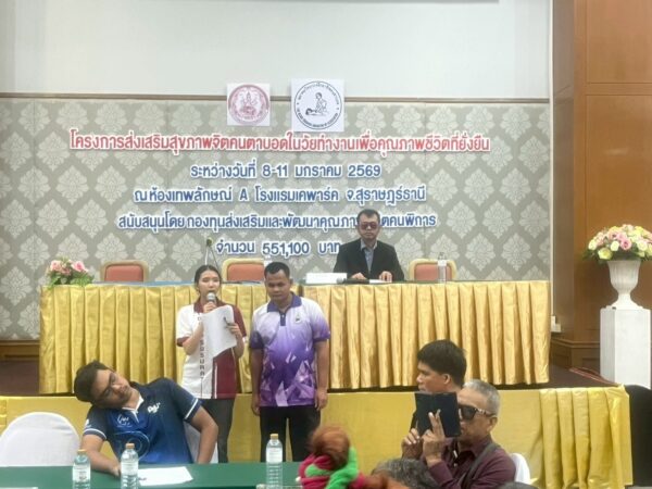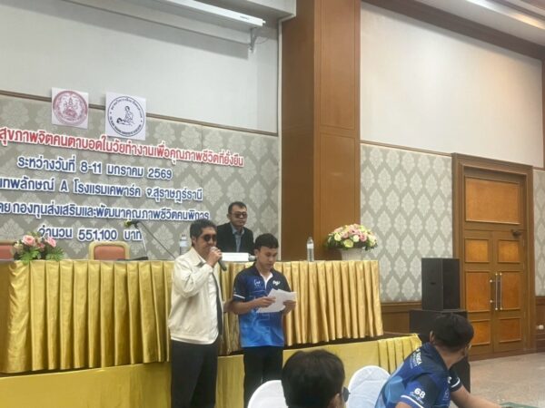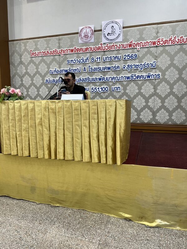 สมาคมวิทยากรฝึกอาชีพคนตาบอด จัดโครงการ “ส่งเสริมสุขภาพจิตคนตาบอดในวัยทำงานเพื่อคุณภาพชีวิตที่ยั่งยืน” ระหว่างวันที่ 8 – 11 มกราคม พ.ศ. 2569 ณ โรงแรมเคพาร์ค จังหวัดสุราษฎร์ธานี เพื่อเสริมสร้างความเข้มแข็งทางจิตใจและพัฒนาศักยภาพการดำรงชีวิตของคนตาบอดในวัยทำงาน พิธีเปิดโครงการได้รับเกียรติจาก นางปุณณิภัค ชื่นสุวรรณ พัฒนาสังคมและความมั่นคงของมนุษย์จังหวัดสุราษฎร์ธานี เป็นประธานในพิธี พร้อมกล่าวให้โอวาท โดยเน้นย้ำถึงความสำคัญของการดูแลสุขภาพจิตของคนตาบอด ซึ่งเป็นปัจจัยสำคัญต่อการดำรงชีวิต การทำงาน และการอยู่ร่วมกับสังคมอย่างมีคุณภาพ ในโอกาสนี้ นายอดิศักดิ์ สอนทอง นายกสมาคมวิทยากรฝึกอาชีพคนตาบอด ได้กล่าวรายงานถึงวัตถุประสงค์ของการจัดโครงการ มุ่งเน้นการส่งเสริมความรู้และทักษะด้านการดูแลสุขภาพจิต การคิดบวก การเสริมพลังใจ รวมถึงการพัฒนาทักษะการสื่อสารและการปรับตัวในสถานที่ทำงาน โครงการดังกล่าวได้รับการสนับสนุนงบประมาณจาก กองทุนส่งเสริมและพัฒนาคุณภาพชีวิตคนพิการ กระทรวงการพัฒนาสังคมและความมั่นคงของมนุษย์ และมีผู้เข้าร่วมกิจกรรมรวมทั้งสิ้น 76 คน ซึ่งเป็นคนตาบอดในวัยทำงานจากพื้นที่ต่างๆ