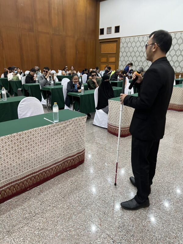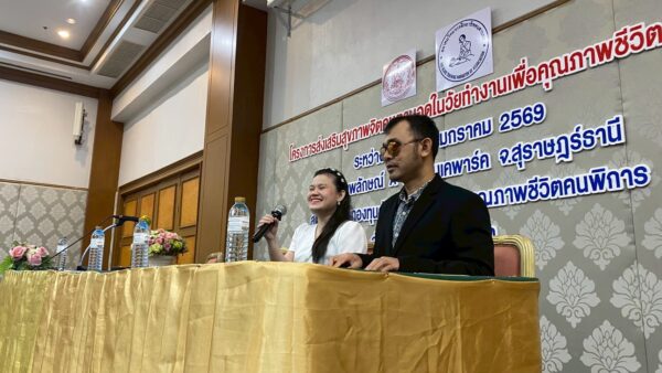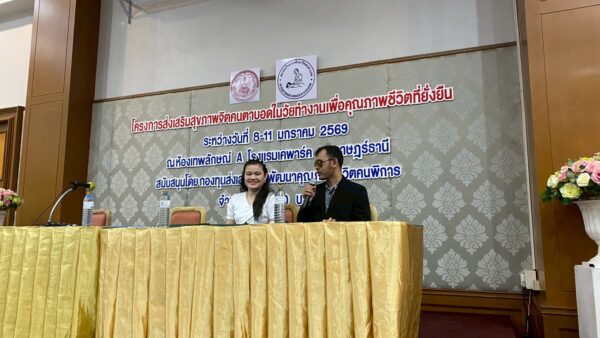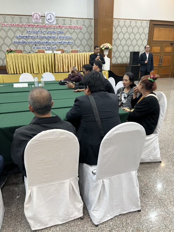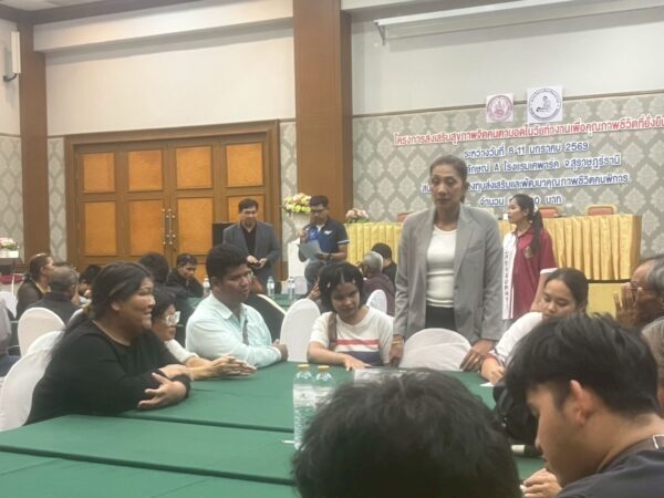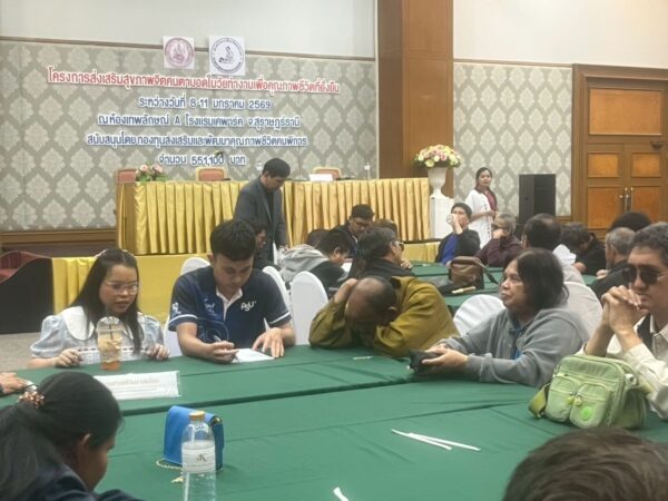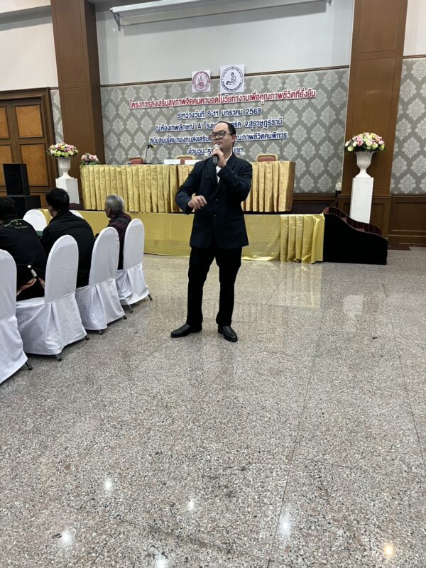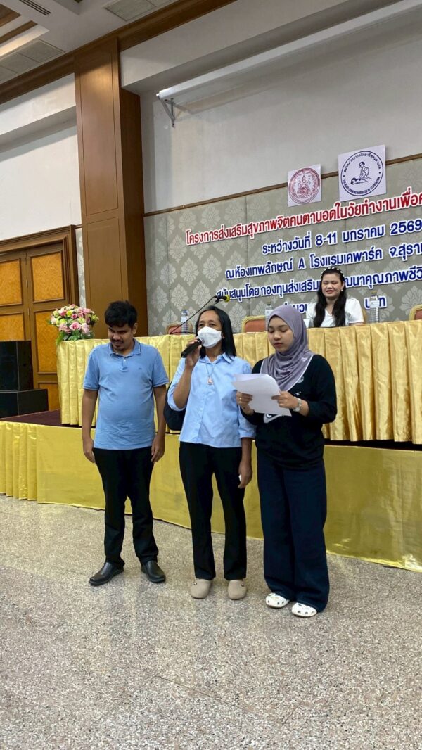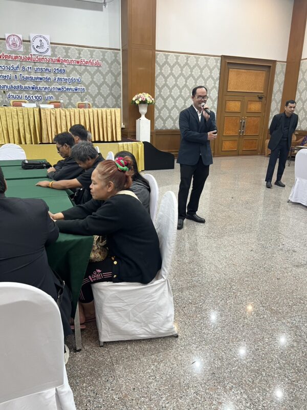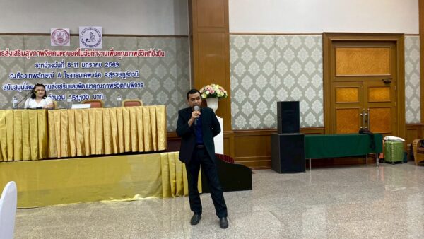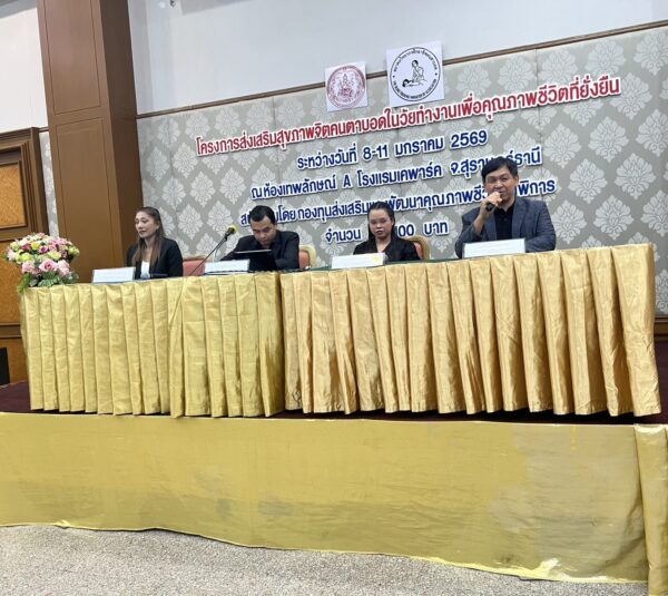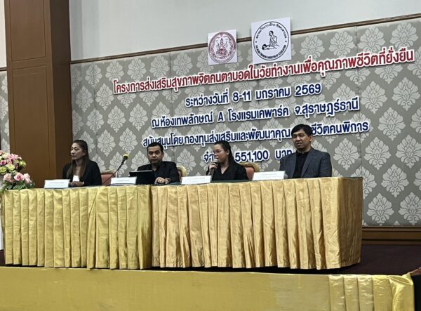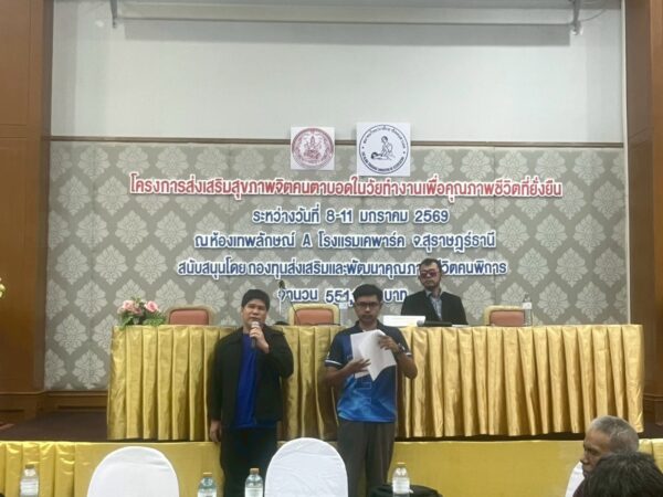 สมาคมวิทยากรฝึกอาชีพคนตาบอด จัดโครงการ “ส่งเสริมสุขภาพจิตคนตาบอดในวัยทำงานเพื่อคุณภาพชีวิตที่ยั่งยืน” ระหว่างวันที่ 8 – 11 มกราคม พ.ศ. 2569 ณ โรงแรมเคพาร์ค จังหวัดสุราษฎร์ธานี เพื่อเสริมสร้างความเข้มแข็งทางจิตใจและพัฒนาศักยภาพการดำรงชีวิตของคนตาบอดในวัยทำงาน พิธีเปิดโครงการได้รับเกียรติจาก นางปุณณิภัค ชื่นสุวรรณ พัฒนาสังคมและความมั่นคงของมนุษย์จังหวัดสุราษฎร์ธานี เป็นประธานในพิธี พร้อมกล่าวให้โอวาท โดยเน้นย้ำถึงความสำคัญของการดูแลสุขภาพจิตของคนตาบอด ซึ่งเป็นปัจจัยสำคัญต่อการดำรงชีวิต การทำงาน และการอยู่ร่วมกับสังคมอย่างมีคุณภาพ ในโอกาสนี้ นายอดิศักดิ์ สอนทอง นายกสมาคมวิทยากรฝึกอาชีพคนตาบอด ได้กล่าวรายงานถึงวัตถุประสงค์ของการจัดโครงการ มุ่งเน้นการส่งเสริมความรู้และทักษะด้านการดูแลสุขภาพจิต การคิดบวก การเสริมพลังใจ รวมถึงการพัฒนาทักษะการสื่อสารและการปรับตัวในสถานที่ทำงาน โครงการดังกล่าวได้รับการสนับสนุนงบประมาณจาก กองทุนส่งเสริมและพัฒนาคุณภาพชีวิตคนพิการ กระทรวงการพัฒนาสังคมและความมั่นคงของมนุษย์ และมีผู้เข้าร่วมกิจกรรมรวมทั้งสิ้น 76 คน ซึ่งเป็นคนตาบอดในวัยทำงานจากพื้นที่ต่างๆ