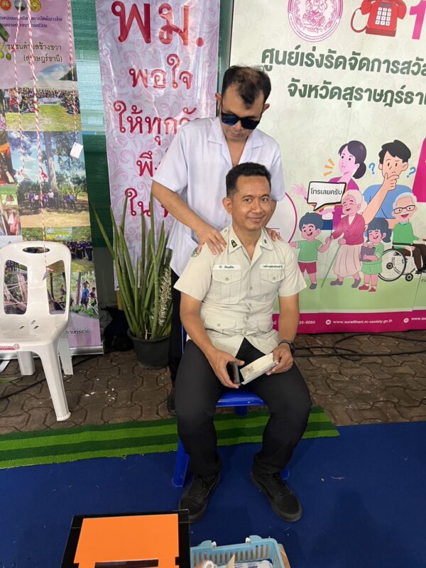 วันที่ 14 กุมภาพันธ์ 2568 สมาคมวิทยากรฝึกอาชีพคนตาบอดนำสมาชิกสมาคมออกให้บริการนวด คอ บ่า ไหล่ (Office syndrome) ฟรีในงานกาชาดจังหวัดสุราษฎร์ธานี ประจำปี 2568 โดยได้รับความกรุณาพื้นที่ในการออกบูธจากพัฒนาสังคมและความมั่นคงของมนุษย์จังหวัดสุราษฎร์ธานี